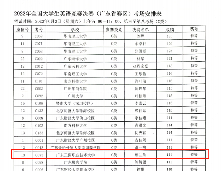 3044永利学子在2023年全国大学生英语竞赛(NECCS)广东赛区决赛中喜获佳绩
