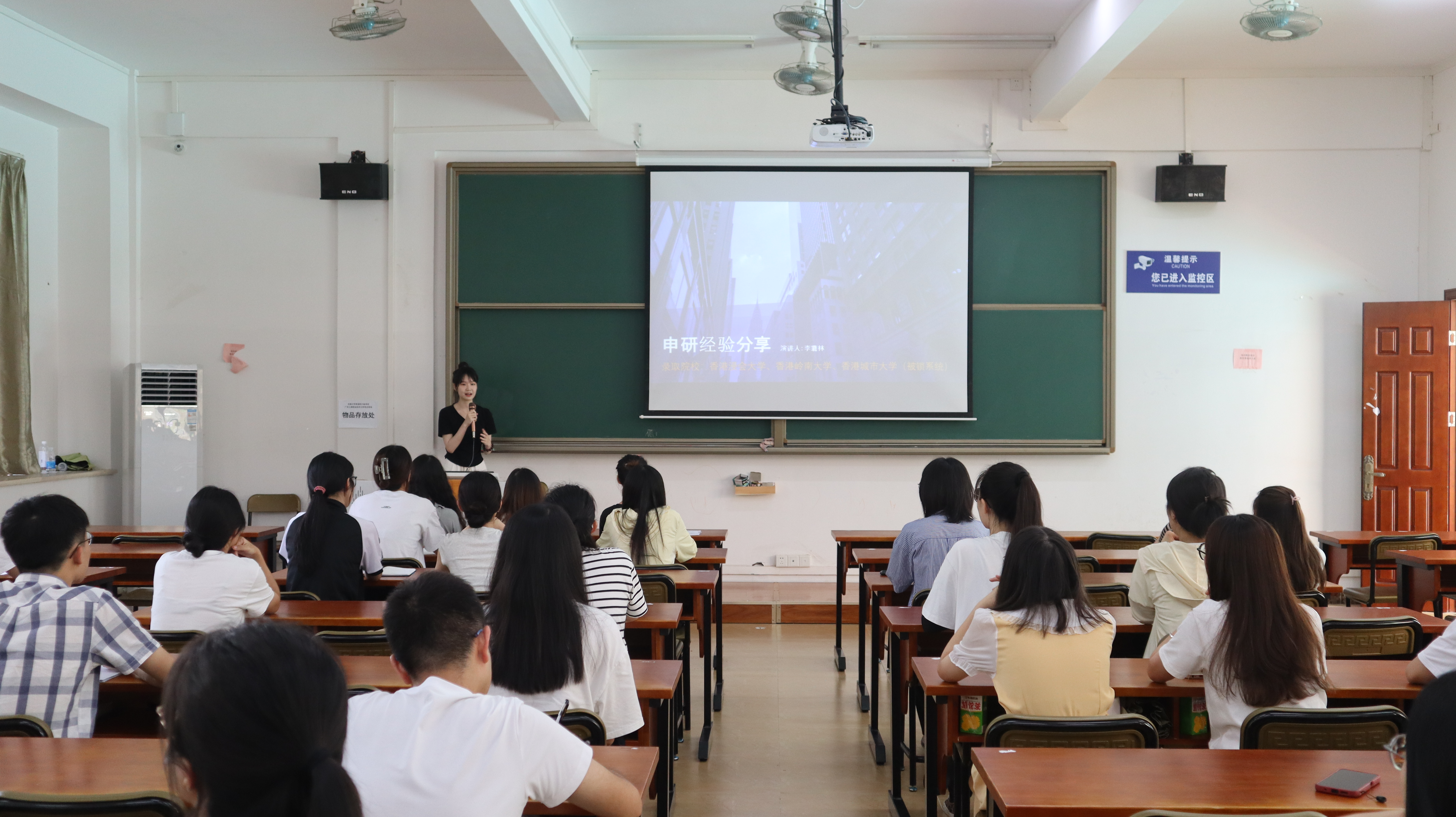 第二项议程,由优秀毕业生代表李莙林同学分享申请中国香港研究生的经历。李莙林同学表示,在有计划进行港澳研究生申请之前,建议通过对网络社交媒体以及官网信息的利用,快速把握申研整体流程。同时可以通过院校资源以及身边的老师、学长学姐提供的信息去进一步了解。她还向大家分享了一个获知复试变动情况的小妙招,以此来更加全面地获取信息。在此过程中,她通过信息检索、个人偏好、专业相关实力以及复试准备这些方面,最终确定自己心仪的院校和专业。