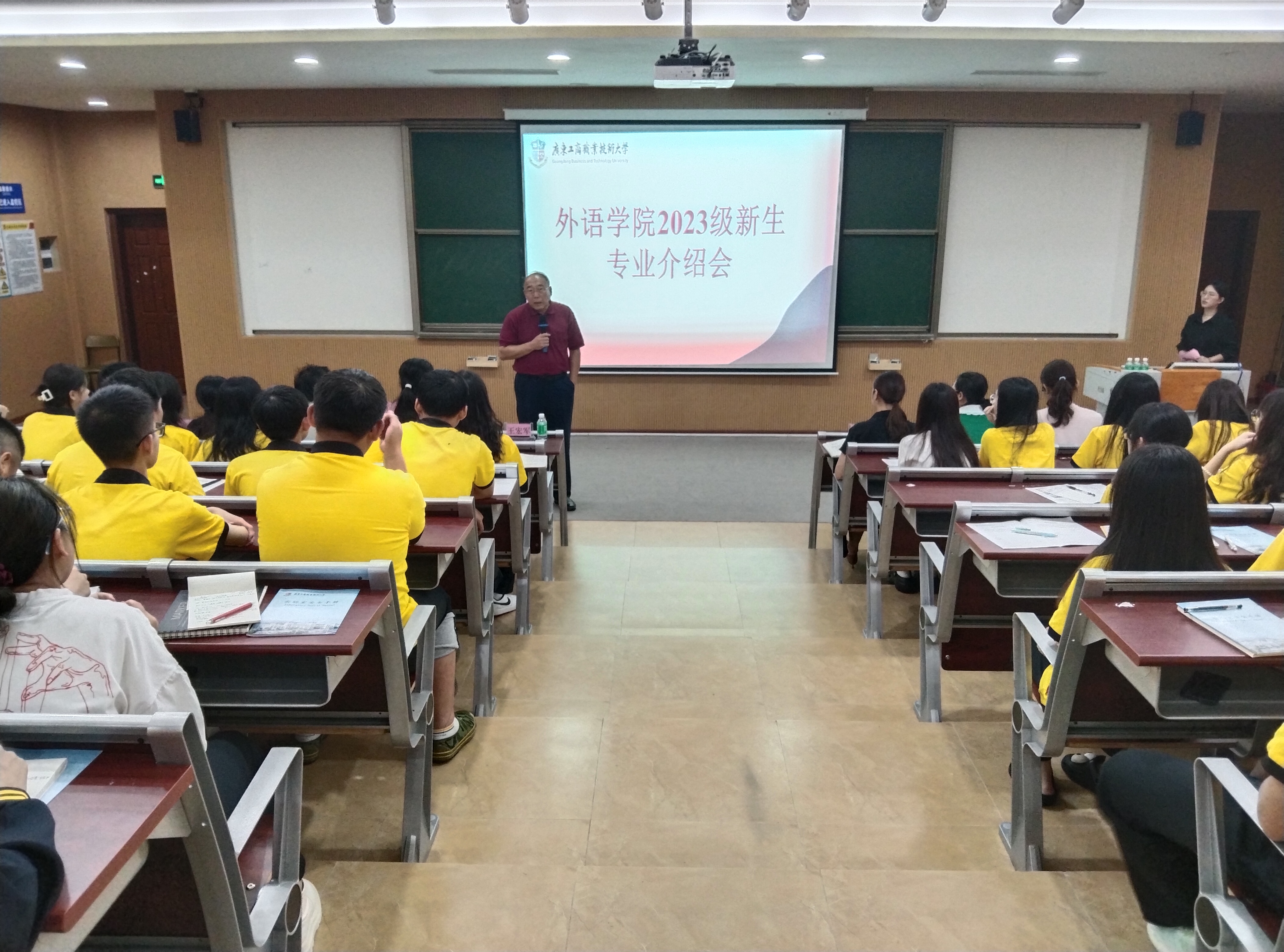 为帮助2023级新生加深对所学专业的认知,了解所学专业的基本情况和行业发展态势,激发学生对专业的学习兴趣,合理规划大学学习生活,外语学院于2023年9月14日19时30分在星湖校区格物楼113举行了外语学院2023级学生专业介绍会。出席本次会议的人员有外语学院院长王宏军,党总支副书记刘蔓,应用日语教研室主任马莹妮,专任教师代表苗得厚、吴政辉和区诗湘,应用英语教研室副主任朱晓利,专任教师代表黄伟、夏梦珠,实训室管理员廖宇轩以及2023级全体新生。本次会议由外语学院刘雨琪主持。
