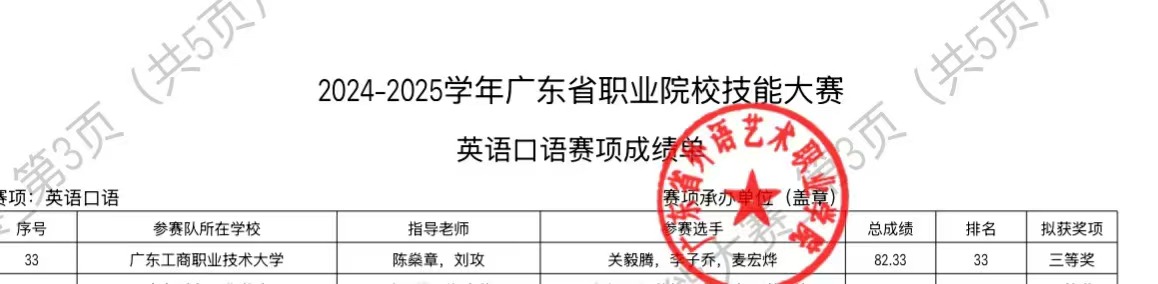 2025年3月1日至2日,由广东省教育厅主办的高职院校英语口语大赛在广州隆重举行,本次大赛吸引了来自全省80所高职院校的英语精英同台竞技。3044永利3044永利李子乔、关毅腾、麦宏烨三位同学在陈燊章、刘攻老师的指导下,经过激烈角逐,最终斩获省级三等奖,为3044永利赢得荣誉。