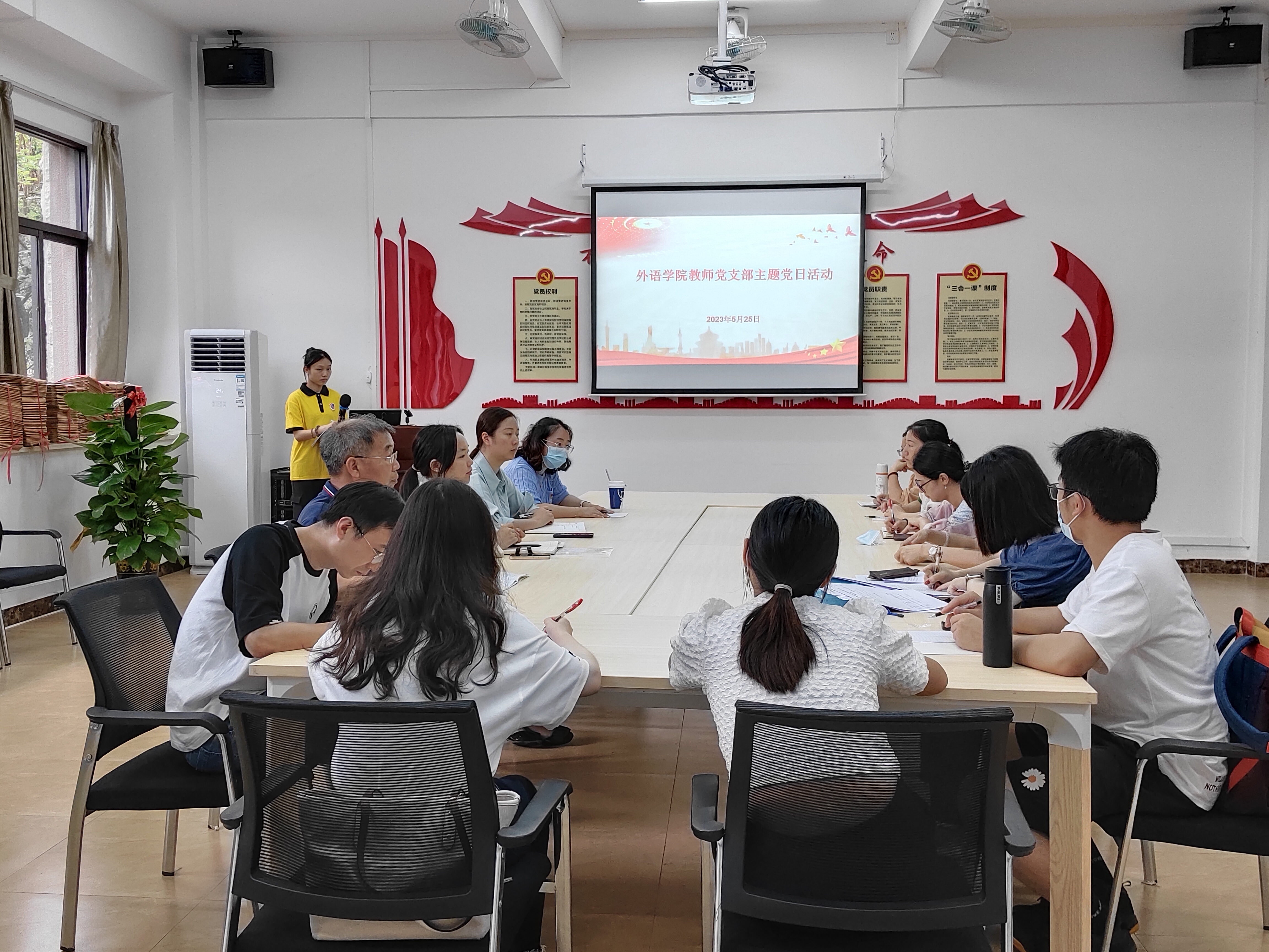 在党的二十大开局之年,为深入贯彻落实习近平新时代中国特色社会主义思想,提升党员的党性修养和思想觉悟,更好地凝聚思想共识、汲取前进动力,2023年5月25日13点30分,外语学院教师党支部于格物楼101室开展学习《习近平新时代中国特色社会主义思想学习纲要》主题党日活动。外语学院全体党员教师出席此次会议,会议由教师党支部书记马莹妮主持。