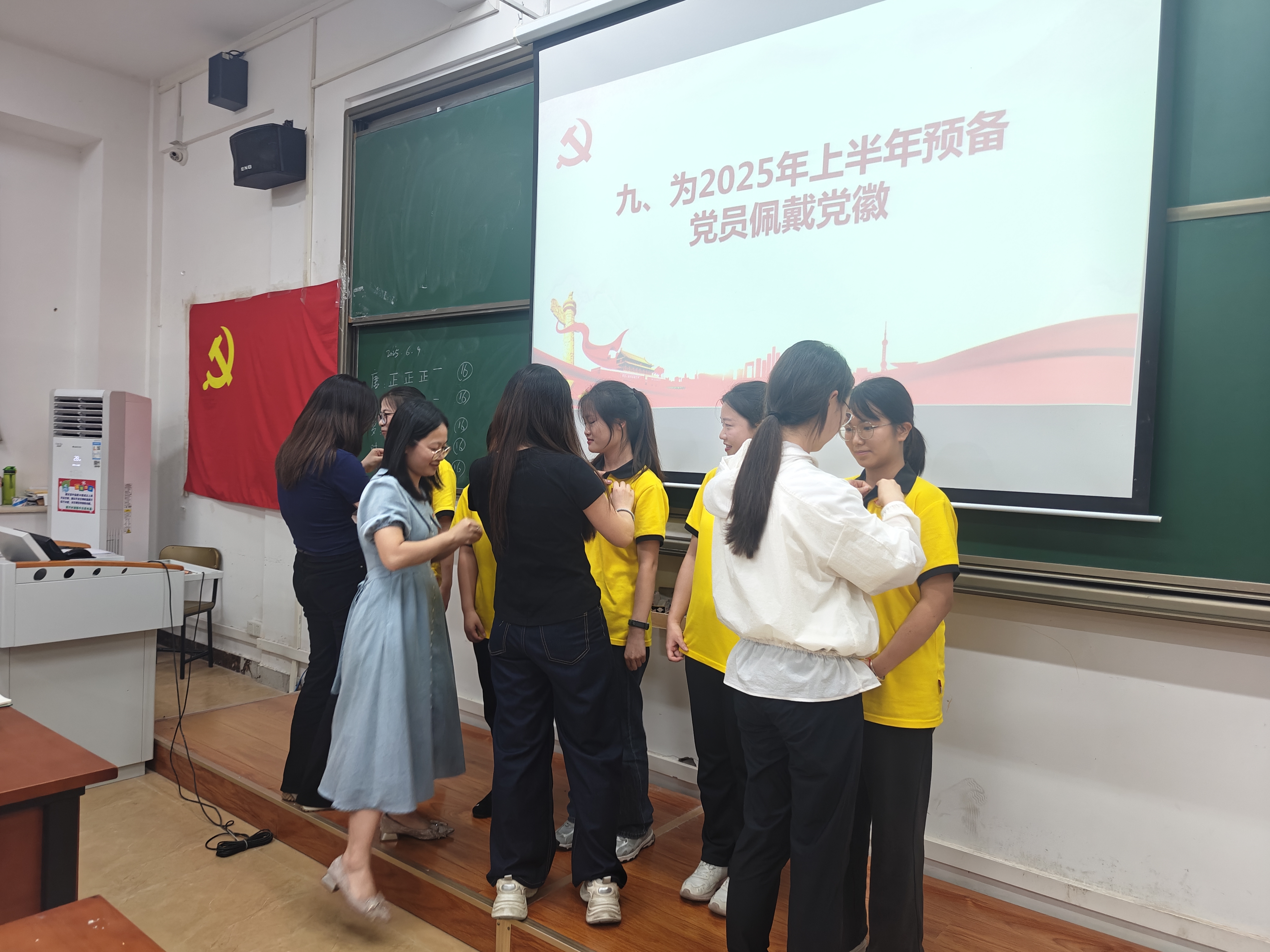 在郑丽玉书记带领下,新预备党员面向党旗庄严宣誓。支部委员为其佩戴党员徽章,通过“仪式教育”强化身份认同。郑丽玉强调,转预备不是终点而是起点,要求全体党员以主题教育常态化长效化为契机,在“学思想、强党性、重实践、建新功”中持续淬炼政治品格,尤其要在专业学习、社会实践、志愿服务中彰显“一个党员就是一面旗帜”的担当。